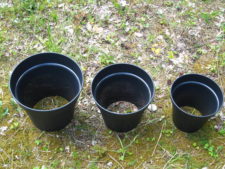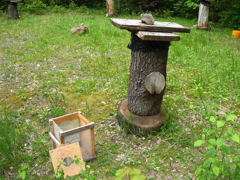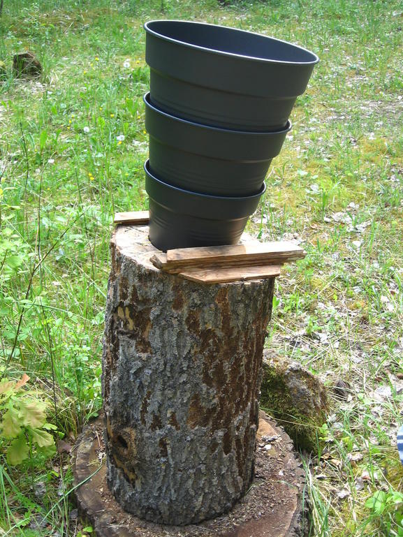 Ich finde eine sehr geschickte Methode um Schwärme oben in die Klotzbeuten zu füllen. Man nehme drei Blumentöpfe au sPlastik und schneide die Böden ab. Dann werden sie gestapelt, der kleinste zuunterst, der große oben drauf.