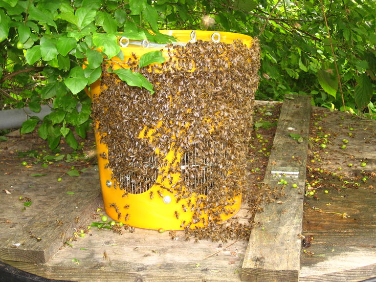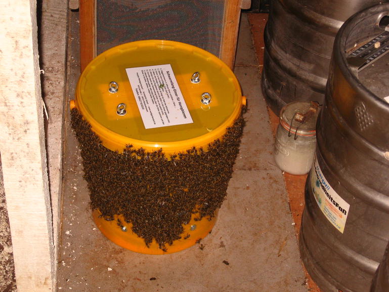 Wenn der Schwarm groß ist und viele Bienen gleichzeitig in den Eimer fallen, fließen sie ähnlich Wasser durch die Gitter wieder raus. Zweitens bildeten sich draußen große Trauben an Bienen, die nicht in den Eimer wollten.