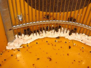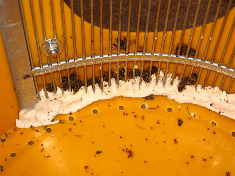 Dieser Schwarm hat es überstanden, aber der Verlust war größer als gehofft: In den Gitterstäben haben sich einige Bienen verfangen und sidn gestorben: