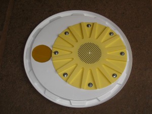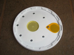 Wenn der Schwarm im Eimer drin ist kommt der Deckel drauf. Da der Deckel des 40kg Eimers recht groß ist, passt neben die Bienenflucht noch ein Loch für den Bienentrichter: