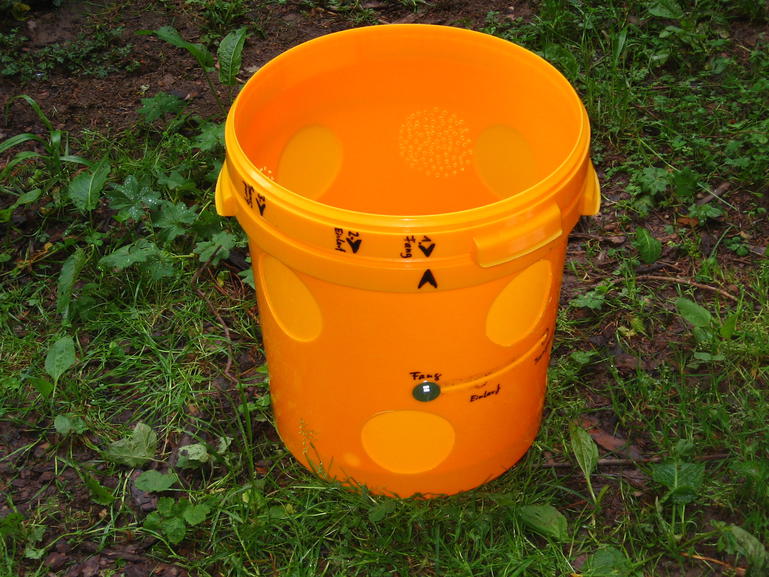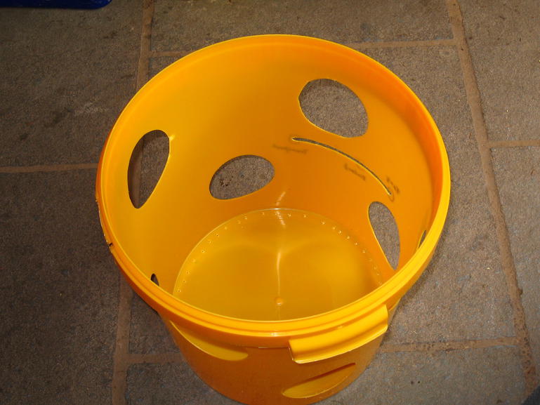 Als erstes habe ich den großen 40kg Eimer genommen, in den Deckel eine Bienenflucht eingebaut und die Aussenwände mit 4mm Löchern übersät (Bauweise wie von Szaufenimkerei empfohlen, nur der größere Eimer). Umgehend hatte ich es mit dem nächsten Schwarm zu tun und musste mit Erstaunen beobachten, dass viele, wirklich sehr viele Bienen sich durch die 4mm Löcher nach Aussen zwängten. Das war also nichts. Es müssen maximal 3mm Löcher sein. Ok, aber was kann noch besser werden?