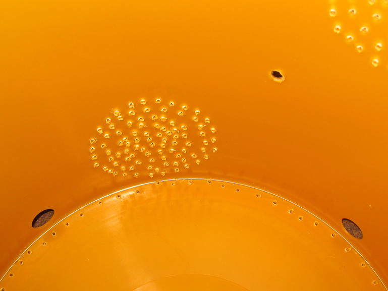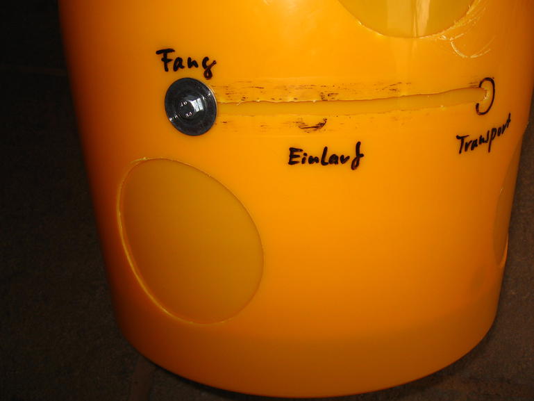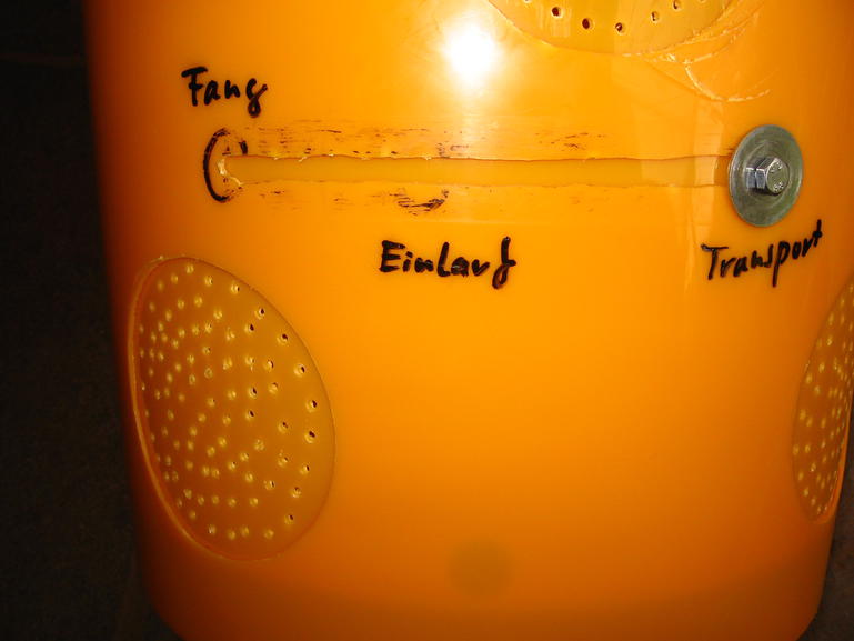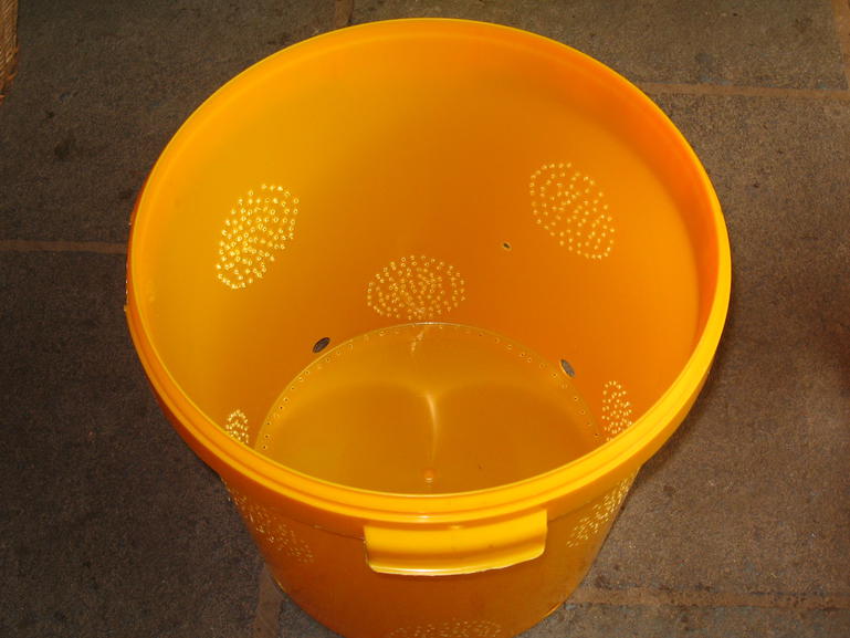 Detailaufnahme, in das Loch, rechts oben im Bild, kommt eine Schraube, diei im äußeren Eimer im Langloch sitzt. Die Löcher unten sind Eingänge wenn Bienen in den Eimer hinein krabbeln dürfen: