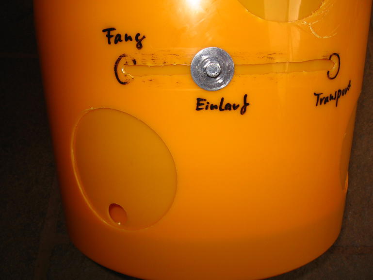 Die Schraube im Langloch dient im übrigen auch dazu, beide Eimer fest zusammen zu halten. Nicht dass man beispielsweise beim Auskippen des Schwarms den Inneneimer mit rauskippt…