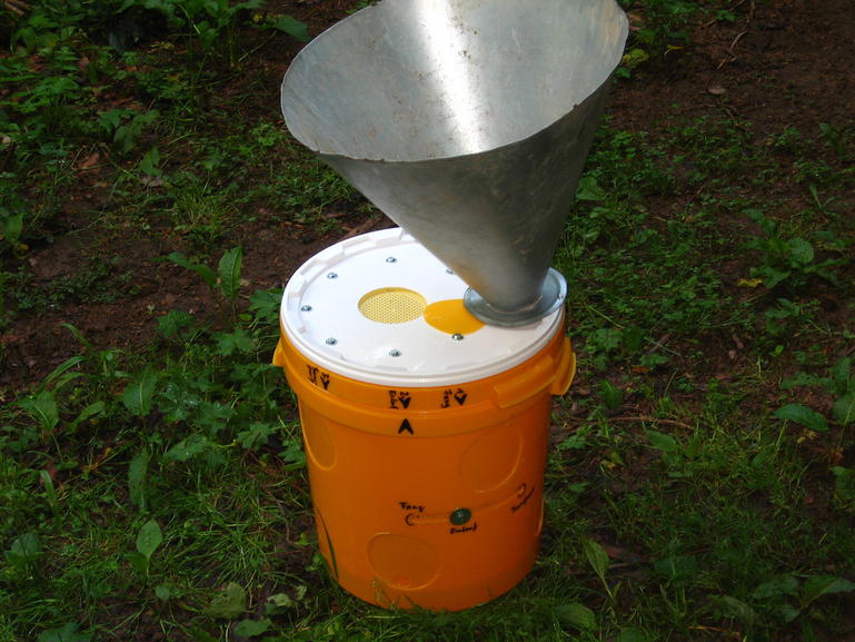 Neben der Bienenflucht im Deckel und den kleinen Einlauföffnungen gibt es keine Löcher durch die der Geruch der Königin die Bienen anlocken kann. Durch den optionalen Trichter kann man kleine Bienenansammlungen leicht in den Eimer befördern. Beispielswiese Haufen von Bienen die an einzelnen Ästen sitzen. Ast wird abgeschnitten und in den Trichter abgeschüttelt… Die Bienenflucht ist dabei geöffent und die Krabbellöcher sind auch offen.