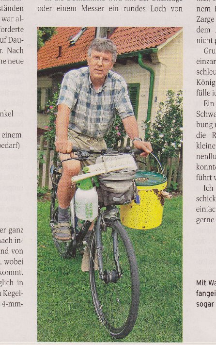 Wenn man mit dem Fahrrad fährt stören einen die Bienen nicht sonderlich, die Aussen auf dem Eimer sitzen. Aber im Auto? Nicht mein Ding. Ausserdem ist der 20/25 kg Eimer mir definitiv zu klein für große Schwärme. Beim 40kg Eimer ist das Einfüllloch größer und im Eimer ist auch mehr Platz für den Schwarm. Darüber hinaus habe ich schon sehr oft über einen Trichter Bienen in eine Schwarmfangkiste befördert. Störend sind auch die vielen Luftlöcher an denen der Königinnenduft ins Freie gelangt und so viele Bienen gar nicht oben über den Deckel und die Bienenflucht in den Eimer wollen.