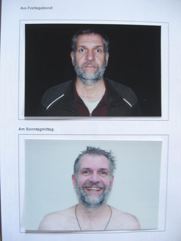 Gut erkennbar ist der Unterschied in meinem Gesicht vorher/nachher. Gleich zu Beginn wurden wir fotographiert. Nun, ich fühlte mich etwas unsicher, wusste nicht was auf mich zu kommt, das Bild hat einen dunklen Hintergrund…