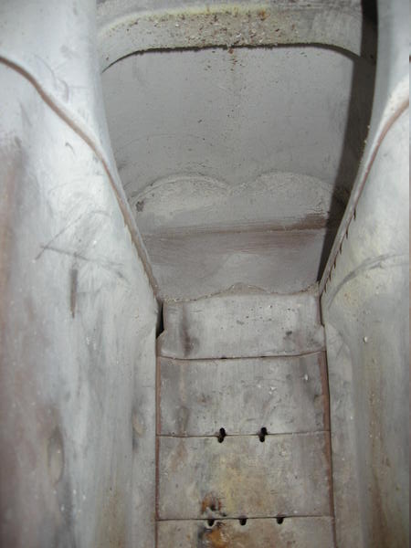Die Brennkammer (Blick nach oben); gut sichtbar die Luftdüsen und die Wirbelkammer an der Decke: