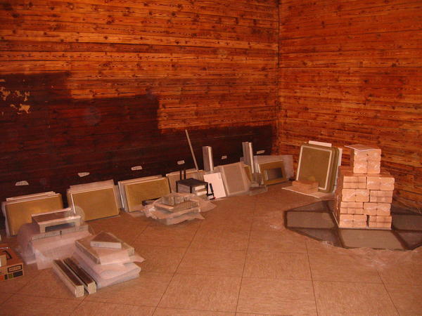 Alle Teile des Bausatzes sind nach oben getragen und geordnet nach Zahlen abgestellt. Der zukünftige Ofenplatz hat einen tragfähigen feuerfesten Untergrund bekommen (rechts im Bild):