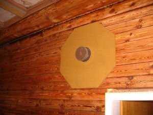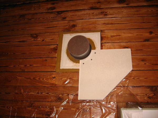 Der Spezial-Wanddurchgang für das Ofenrohr durch Holzwände bekommt noch Schutzplatten gegen Wärmestrahlung vom Ofenrohr: