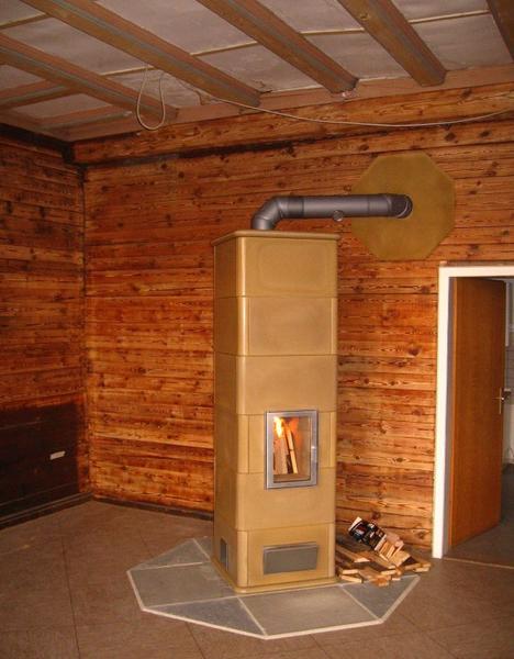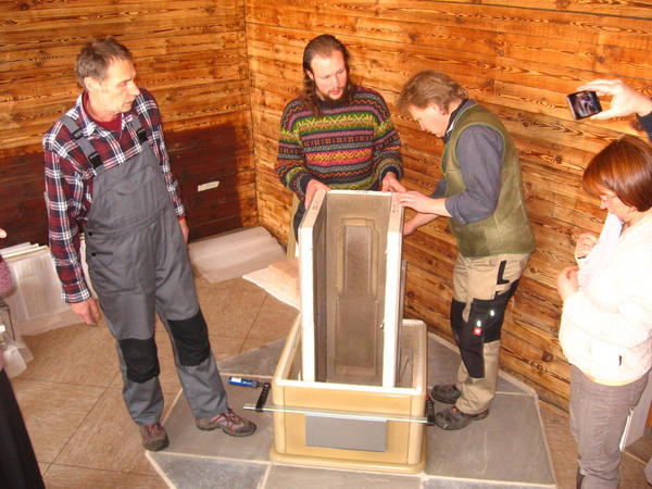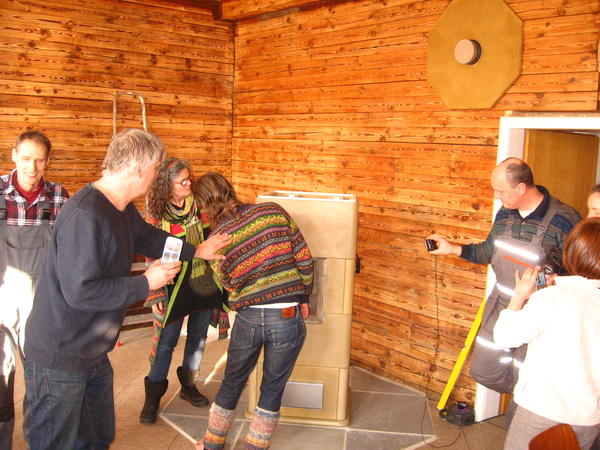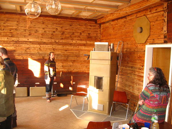 Nachdem wir vor einer Woche den kleinen Speicherofen aufgestellt hatten, kam nun ein 10D an die Reihe, der Größte im Angebot von Tigchel. Unser Versammlungsraum im EG hat über 50 qm und die Deckenhöhe ist beachtlich. Daher braucht dieser Raum mehr Wärme als der Flur im 1. OG, also auch einen größeren Ofen.