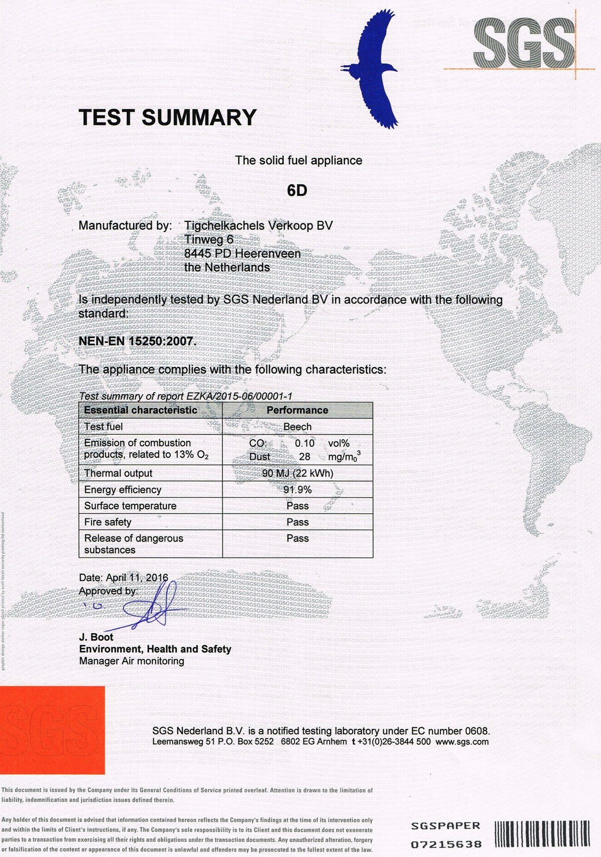 Vor wenigen Wochen kam ein Tigchel Speicherofen 6D in den Niederlanden auf den Prüfstand eines unabhängingen Prüfinstituts. Der 6D ist zwei Nummern kleiner als der bei uns im Februar aufgestellte 10D. Der 6D ist 150 cm hoch und ist empfohlen für Räume von 40-60m² (150 m³). Laut dem bisherigen Herstellerdatenblatt hat der 6D einen Wirkungsgrad von 87%. Der neue Prüfbericht bescheinigt eine Energieeffizienz von 91,9%. Offensichtlich ist der Hersteller mit der Angabe 87% auf Nummer sicher gegangen, frei nach dem Motto: „lieber untertreiben als übertreiben.“ Die Angabe 91,9 liegt ca. 5,6% über dem bisherig angegebenen Wert.