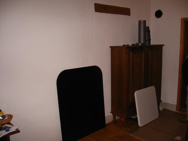 Die Situation im Raum, in der Ecke der Schornsteinanschluss. Das Bodenblech lehnt noch an die Wand: