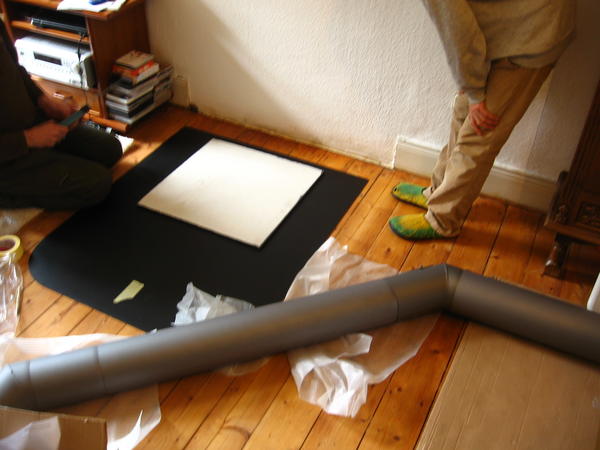 Die Ofenrohre wurden zusammengesteckt um die genaue Position des Bodenblechs zu bestimmen. Die mitgelieferte Dämmplatte wird auf das Bodenblech gelegt: