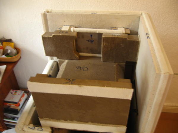 Alle Teile werden trocken, also ohne Mörtel, zusammengesteckt. Damit kann der Ofen bei Bewegungen des Untergrundes (hier z.B. ein Holzboden) nachgeben ohne Risse zu bekommen. Der Tigchel Ofen kann bei Bedarf, z.B. Umzug, auch relativ leicht wieder abmontiert und an anderer Stelle neu aufgebaut werden. Allerdings sind nach dem ersten Anfeuern die Beschriftungen teilweise nicht mehr erkennbar und man muss bei der Demontage die Steine entsprechend markieren.