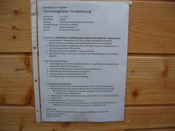 Es ergab sich für mich die Möglichkeit am Tag der offenen Tür dem Projekt einen Besuch abzustatten. Es war richtig voll, besser übervoll. Massen an Menschen wollten das Projekt und das Earthship sehen. Für die nächste Führung in das Earthship musste ich mich etwas gedulden. So nutze ich die Zeit, die umliegenden Hütten und Bauwägen wahrzunehmen. An einer Hütte erstaune ich sehr: Es war die „Forschungshütte Temperierung“: