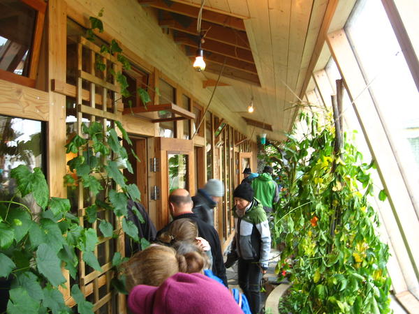 Der Innenraum umfasst ca. 160 m². Es wurde viel Schaumglasschotter verbaut (viel ökologischer als Styropor) und viel Beton (weil das die Statiker vorgeschrieben haben). Dann wurde nachgefragt, wie viel das Earthship denn gekostet hätte. Wieder bekam ich einen Schreck: Sage und schreibe 380.000 Euro! Und sie haben noch nicht mal eine Solarwarmwassertechnik. Dafür sammeln sie noch Spenden…