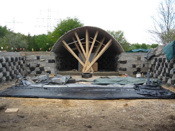 Hm, ich glaub das nicht. Faktor 3 zu 1? Nee, niemals. Ausserdem kann man auch Earthbags füllen und verdichten und hat dabei extrem weniger Arbeit als beim Füllen von Reifen. Es macht auch praktisch keine Arbeit, und fast keine Mehrkosten, die Gesamtspeichermasse aus Erde um einen Meter nach Norden zu vergrößern. Wärmetechnisch wäre der Effekt wohl ähnlich, wenn nicht besser. Reifen haben ja auch den Effekt der Wärmedämmung (Gummi ist ein schlechter Wärmeleiter). Das bedeutet, dass eine Wärmespeicherwand mit Altreifen die Wärme schlechter aufnimmt und abgibt als wenn keine Reifen in der Wand verbaut wären. Diesen Effekt zu kompensieren durch besonders heftige Komprimierung des Füllmaterials? Wirkt nicht sinnvoll. Der einzige Grund für Altreifen wäre eine gewisse Erdbebenstabilität, doch die gibt es auch bei Earthbag-Bauweise. Ausserdem wirkt der Rest vom Earthship, mit den vielen schweren Dachbalken und dem Gewächshaus, nicht wirklich erdbebensicher.