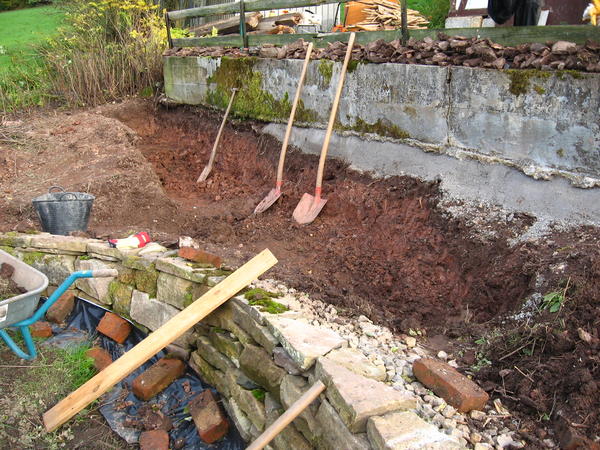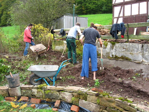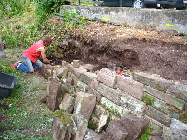 Das Grundstück des Waldgärtnerhauses im Ort Bauhaus grenzt an eine Hoffläche des Nachbarhauses. Der Höhenunterschied beträgt ungefähr einen Meter. Die alte Betonmauer am oberen Rand der Hoffläche war teilweise unterhöhlt, in der davor liegenden Erdböschung fanden sich Reste von uralten umgefallenen Trockensteinmauern.