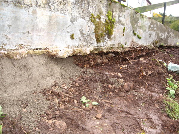 Zunächst wurde die Unterhöhlung der alten Mauerkrone mit Beton verstopft:
