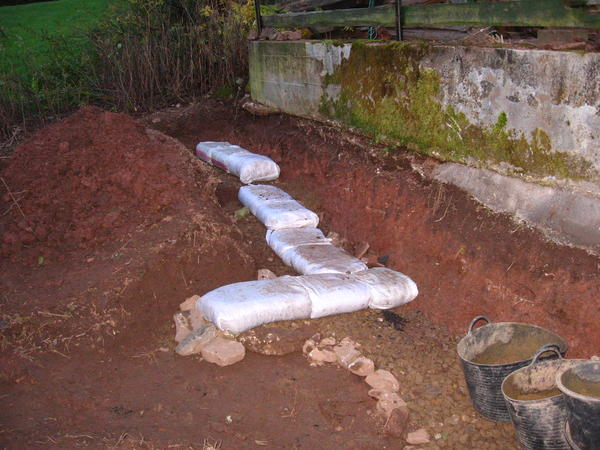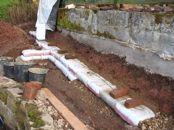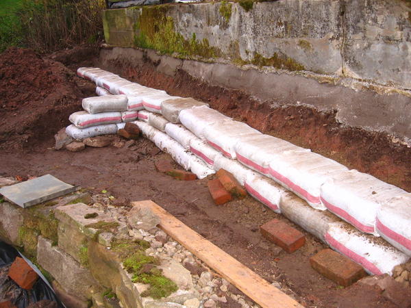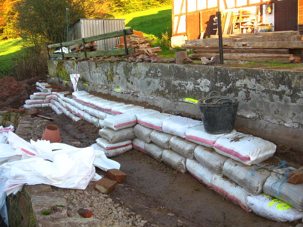 Insbesondere der hintere Bereich des Geländeversatzes braucht eine zusätzliche Abstützung. Wir haben uns entschieden dort eine Stützmauer aus gefüllten Säcken zu bauen.