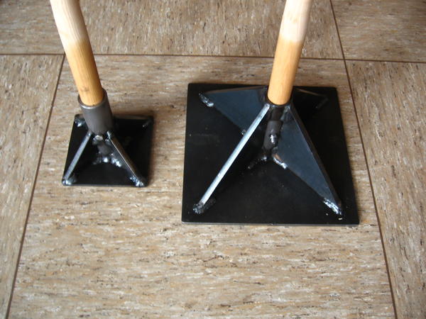 Der Stiel ist ein Feldhackenstiel 135 cm x 3,5 cm Durchmesser. Er steckt in einem Präzisionsrohr aus Stahl mit Innendurchmesser 35 mm, fixiert mit einer durchgehenden Edelstahlschraube M8 und selbstsichernden Mutter. Die Bodenplatte und die Dreiecke bestehen aus 10 mm dickem Stahl wobei die Bodenplatte an den Rändern sehr stark gerundet ist. Dies ist wichtig, damit das Gewebe der Säcke beim Stampfen intakt bleibt. Der größere Stampfer wird genommen um gleichmäßigere Flächen zu erzielen. Der kleinere Stampfer ist gut geeignet um punktueller stärker zu verdichten.