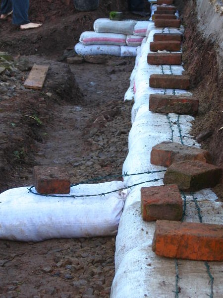 Jede Sackreihe wird vor dem Verlegen des Stacheldrahtes stark verdichtet mit Erdstampfern: