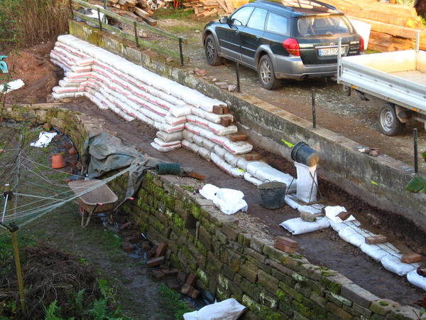 Die Mauer hat eine Länge von 21,2 m. An der niedrigsten Stelle ist sie 0,45 m hoch, an der höchsten 1,05 m. Im unteren Bereich wird teilweise verfüllt, deshalb wird später die sichtbare maximale Höhe ca. 0,8 m sein. Ein leerer Sack hatte das Format 70 x 45 cm. Ein voll gefüllter Sack hat im Durchschnitt das Format 55 x 35 x 14 cm.