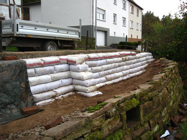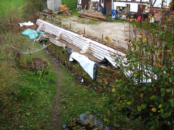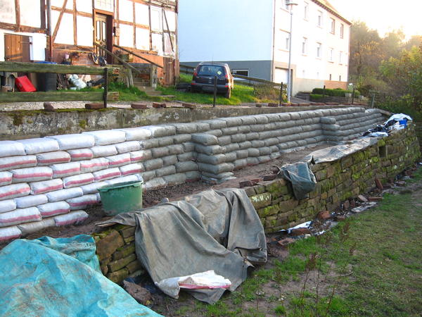 Der fertige Teil wurde mit Plane abgedeckt als UV-Schutz. Der restliche Teil der Stützmauer ist jetzt auch fertig: