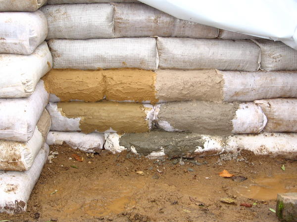 Als nächste Aktion wird die Sackwand von Verunreinigungen geputzt und mit dünner Zementschlämme grundiert. Der Zement kriecht in die feinen Fugen des Gewebes der Säcke und bildet so den Haftvermittler. Nach dem Aushärten kommt der Endputz drauf. Je nach Wetterentwicklung kann dies auch erst gegen Ende des Winters / Anfang Frühling so weit sein.