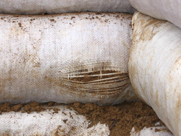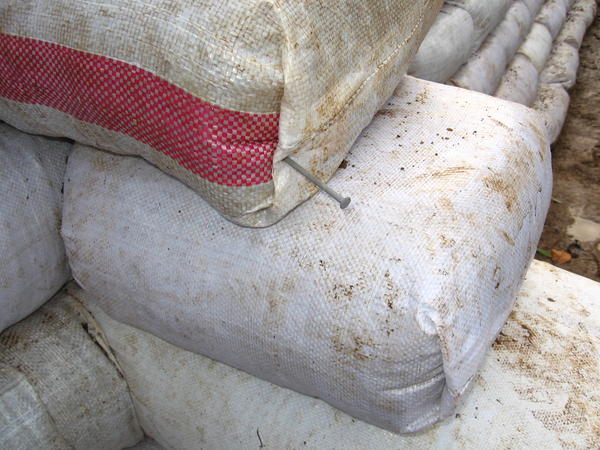 Noch ein Hinweis für diejenigen, die so etwas nachbauen wollen: Wer gebrauchte Säcke nutzt (wie wir), sollte darauf achten, dass das Material noch nicht lange dem Licht ausgesetzt war. Nach ein paar hundert Sonnenstunden wird das Gewebe brüchig. Ein Sack, zum Glück einer, der später unter der Erdoberfläche verschwindet, ist ein Riss entstanden. Alle anderen Säcke sind fest geblieben: