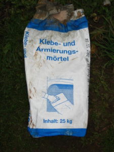 Mit Klebe- und Armierungsmörtel habe ich dann die Säcke grundiert. Hierbei war das passende Werkzeug eine Malerbürste (Quast). Statt den empfohlenen 6 Liter Wasser auf 25 kg Mörtel habe ich 7,25 Liter genommen. Damit war der Mörtel so dünnflüssig, dass er sich gut mit dem Pinsel auftragen ließ. Durch die Pinselborsten gab es eine sehr rauhe Oberfläche. Darauf wird der Endputz gut halten.