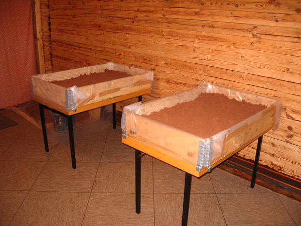 Im Waldgärtnerhaus sind die Tische im Format 120 x 75 cm. Darauf habe ich Hartfaserplatten (3 mm) im gleichen Format gelegt als Schutz für die Tischoberfläche. Darauf passt genau ein Palettenaufsatzrahmen 80×120. Diesen habe ich mit stabiler Bauplane ausgelegt. Pro Tisch kamen ca. 200kg extrafeiner Sand (0-1 mm) hinein, den ich am Kieswerk an der Fulda holte. Es handelt sich um das Sediment vom Reinigen des Kieses und hat dadurch einen sehr hohen Anteil an allerfeinsten Partikeln. Dieser Sand, feucht in Form gebracht, wird beim Trocken ziemlich fest und zerbröselt nicht von alleine wie üblicher Sand. Andererseits ist dieser Sand nicht so fest wie getrockneter Lehm.