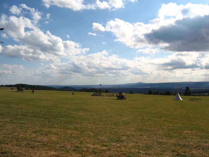 Ein Blick über das Gelände (ca. 2 Quadratkilometer groß) mit weiter Aussicht über die Rhön, in der Bildmitte die Küche, rechts im Bild der Platz für das zentrale Feuer: