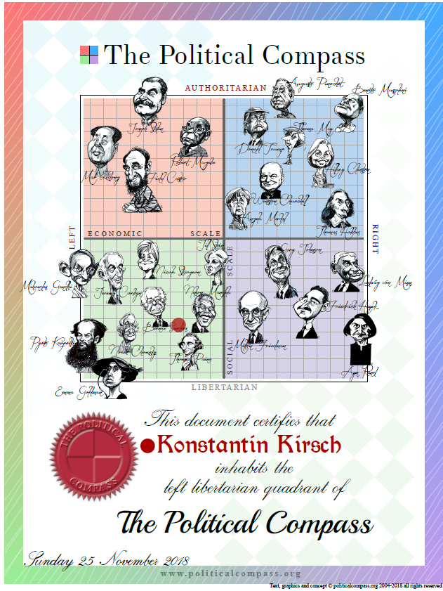 Dann kann man noch ein Zertifikat als PDF runterladen auf dem neben dem eigenen Punkt mehrere Karikaturen von bekannten Personen der Zeitgeschichte abgebildet sind.