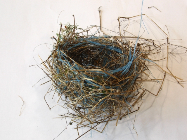 Vor ein paar Tagen fand ich in einer Hecke eine Überraschung: Ein leeres Vogelnest, zum Großteil aus blauen Fasern!