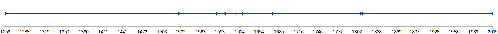 Dies sind nun einfach so ein paar Zahlen. Interessanter wird es in der Darstellung eines Zeitstrahles. Wobei ich mich konzentriere auf die Ereignisse ab 1258. Als Bezugspunkt habe ich auch das aktuelle Jahr mit angegeben, wobei wir ja aktuell einen Sommer haben. Ich will jedoch darstellen, wo wir uns aktuell auf dem Zeitstrahl befinden: