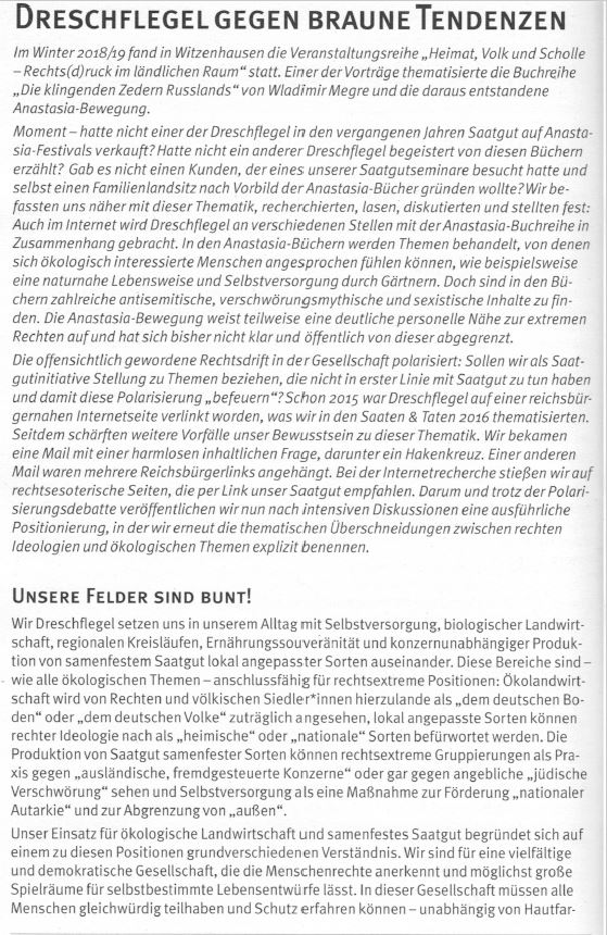 Moment – hatte nicht einer der Dreschflegel in den vergangenen Jahren Saatgut auf Anastasia-Festivals verkauft? Hatte nicht ein anderer Dreschflegel begeistert von diesen Büchern erzählt? Gab es nicht einen Kunden, der eines unserer Saatgutseminare besucht hatte und selbst einen Familienlandsitz nach Vorbild der Anastasia-Bücher gründen wollte? Wir befassten uns näher mit dieser Thematik, recherchierten, lasen, diskutierten und stellten fest: Auch im Internet wird Dreschflegel an verschiedenen Stellen mit der Anastasia-Buchreihe in Zusammenhang gebracht. In den Anastasia-Büchern werden Themen behandelt, von denen sich ökologisch interessierte Menschen angesprochen fühlen können, wie beispielsweise eine naturnahe Lebensweise und Selbstversorgung durch Gärtnern. Doch sind in den Büchern zahlreiche antisemitische, verschwörungsmythische und sexistische Inhalte zu finden. Die Anastasia-Bewegung weist teilweise eine deutliche personelle Nähe zur extremen Rechten auf und hat sich bisher nicht klar und öffentlich von dieser abgegrenzt.