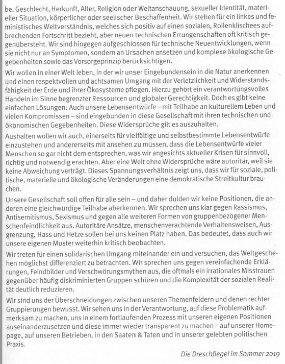 Wir Dreschflegel setzen uns in unserem Alltag mit Selbstversorgung, biologischer Landwirtschaft, regionalen Kreisläufen, Ernährungssouveränität und konzernunabhängiger Produktion von samenfestem Saatgut lokal angepasster Sorten auseinander. Diese Bereiche sind -wie alle ökologischen Themen – anschlussfähig für rechtsextreme Positionen: Ökolandwirtschaft wird von Rechten und völkischen Siedler*innen hierzulande als „dem deutschen Boden“ oder „dem deutschen Volke“ zuträglich angesehen, lokal angepasste Sorten können rechter Ideologie nach als „heimische“ oder „nationale“ Sorten befürwortet werden. Die Produktion von Saatgut samenfester Sorten können rechtsextreme Gruppierungen als Praxis gegen „ausländische, fremdgesteuerte Konzerne“ oder gar gegen angebliche „jüdische Verschwörung“ sehen und Selbstversorgung als eine Maßnahme zur Förderung „nationaler Autarkie“ und zur Abgrenzung von „außen“. Unser Einsatz für ökologische Landwirtschaft und samenfestes Saatgut begründet sich auf einem zu diesen Positionen grundverschiedenen Verständnis. Wir sind für eine vielfältige und demokratische Gesellschaft, die die Menschenrechte anerkennt und möglichst große Spielräume für selbstbestimmte Lebensentwürfe lässt. In dieser Gesellschaft müssen alle Menschen gleichwürdig teilhaben und Schutz erfahren können – unabhängig von Hautfarbe, Geschlecht, Herkunft, Alter, Religion oder Weltanschauung, sexueller Identität, materieller Situation, körperlicher oder seelischer Beschaffenheit. Wir stehen für ein linkes und feministisches Weltverständnis, welches sich positiv auf einen sozialen, Rollenklischees aufbrechenden Fortschritt bezieht, aber neuen technischen Errungenschaften oft kritisch gegenübersteht. Wir sind hingegen aufgeschlossen für technische Neuentwicklungen. wenn sie nicht nur an Symptomen, sondern an Ursachen ansetzen und komplexe Ökologische Gegebenheiten sowie das Vorsorgeprinzip berücksichtigen.Wir wollen in einer Welt leben, in der wir unser Eingebundensein in die Natur anerkennen und einen respektvollen und achtsamen Umgang mit der Verletzlichkeit und Widerstandsfähigkeit der Erde und ihrer Ökosysteme pflegen. Hierzu gehört ein verantwortungsvolles Handeln im Sinne begrenzter Ressourcen und globaler Gerechtigkeit. Doch es gibt keine einfachen Lösungen: Auch unsere Lebensentwürfe — mit Teilhabe an kulturellem Leben und vielen Kompromissen — sind eingebunden in diese Gesellschaft mit ihren technischen und ökonomischen Gegebenheiten. Diese Widersprüche gilt es auszuhalten.