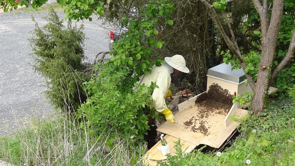 Ein Bienenschwarm läuft in die Beute ein. Die Hauptmasse der Bienen ist schnell im „Windfang“. Der komplette Einzug durch den schmalen Schlitz dauert etwas: