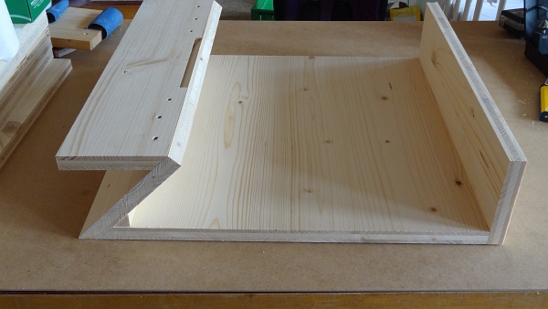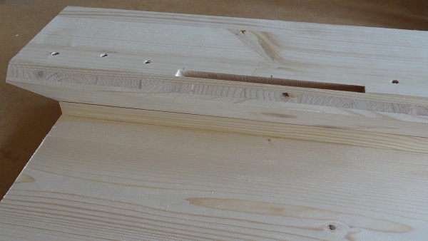 In der Montagereihenfolge wird zuerst das waagerechte Brett mit dem Flugschlitz an das schräge Brett geleimt (wasserfest!) und verschraubt. Dann wird das schräge Brett an den Boden geleimt / geschraubt, dann die Rückwand und dann die Seitenwände: