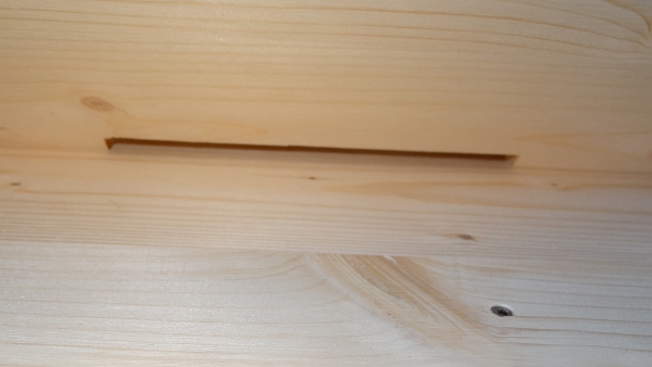 Der Eingang ist ein Schlitz von 7 mm Tiefe und 150 mm Breite. Er ist nur im waagerechten Brett herausgesägt. Dies schafft man durch eine Tischkreissäge bei der das Sägeblatt exakt 7 mm herausschaut und man die 45° Schräge auf dem Sägetisch langsam! hin und her bewegt bis der Flugschlitz fertig ist.
