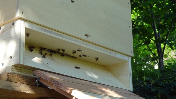 Auffälliges Verhalten: Anfliegende Bienen landen meist auf der Schräge im Windfang. Die ausfliegenden Bienen laufen überkopf vom Schlitz bis nach vorne zur Kante und starten dann den Flug: