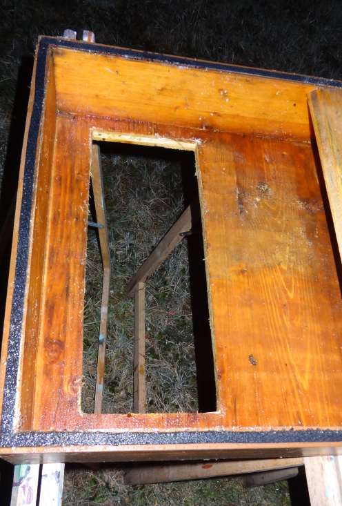 Die aufgesetzte Brutraumzarge ist im Maß ‚Dadant nach Beer‘ der Firma Bienen-Ruck und hat ein Außenmaß von 51,5 x 51,5 cm. Der Boden ist etwas kleiner und hat 50 x 50 cm. Beides wird noch lackiert. Genau gesagt wird ein baugleicher Boden und eine weitere Brutraumzarge lackiert. Nach dem Aushärten der Farbe wird das Bienenvolk dann umgesetzt wobei der Standort gleich bleibt. Die nicht lackierte Version ist nur im Einsatz weil unerwartet ein Schwarm auftauchte, der umgehend eine Wohnung brauchte. Idealerweise baut man Bienenwohnungen im Winter und ist dann im Frühjahr fertig vorbereitet. Der schräge Windfang ist mit einem großen Anflugbrett erweitert wobei die im Bild sichtbare Konstruktion aus mehrerern Brettern mir nicht so gut gefällt wegen den doch eher großen Abständen zwischen den einzelnen Brettern. Ich habe jetzt ein größeres Sperrholzbrett im Einsatz (das bis auf den Boden geht).
