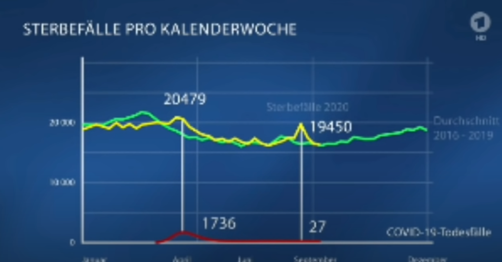 Die hellgrüne Linie ist die durchschnittliche Anzahl an Sterbefällen pro Woche in Deutschland der Jahre 2016 bis 2019. Die Gelbe Linie ist die entsprechende Anzahl des aktuellen Jahres 2020 und die ganz unten laufende Linie sind die als Corona-Toten bezeichneten Sterbefälle. Im April gab es eine kurzzeitige Übersterblichkeit in Zusammenhang mit 1736 Corona-Toten. Im August gab es noch mal einen kleinen Anstieg der jedoch der Sommerhitze zugeordnet wird und nicht Corona, es ist auch auf der unteren Linie kein Anstieg zu sehen.