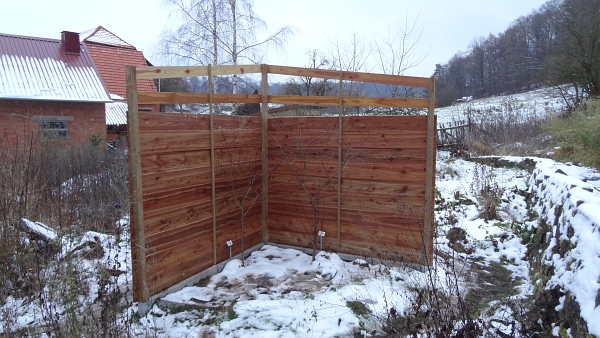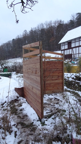 Die oberen zwei Bretter pro Seite dienen dem zusätzlichen Windschutz, insbesondere bei eiskaltem und scharfem Nordwind. Durch die zwei Lücken zwischen den Brettern entstehen Luftwirbel so dass der Wind nicht in voller Wucht über die geschlossene Wand herüber und herunter weht. Wichtig ist dabei, das die oberen Luftdurchlässe größer sind als die unteren.