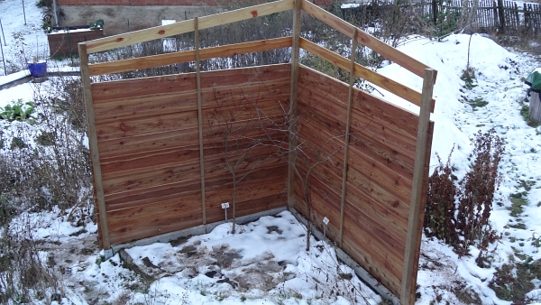 So habe ich für die Aprikosen auch eine 90° Sonnenfalle gebaut, diesmal deutlich größer. Der 90° Winkel ist nach Süden geöffnet, die Schenkel gehen also nach Süd-West und Süd-Ost: