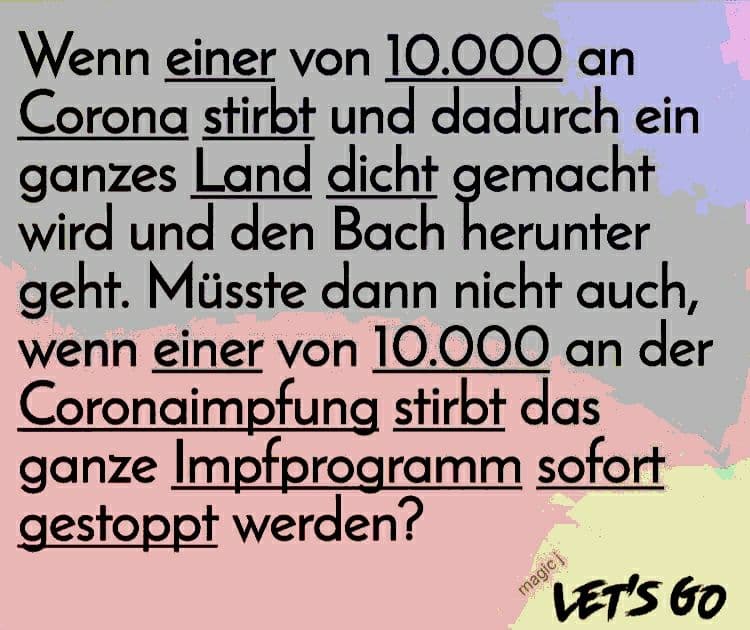 Im Netz kursieren die wildesten Geschichten, bis zur Behauptung, das die Impfungen direkt zum Tod führen würden. Nun, für diejenigen, die direkt nach der Impfung gestorben sind war dies so, aber diejenigen, die die Impfung überlebt haben war es eben nicht so.
