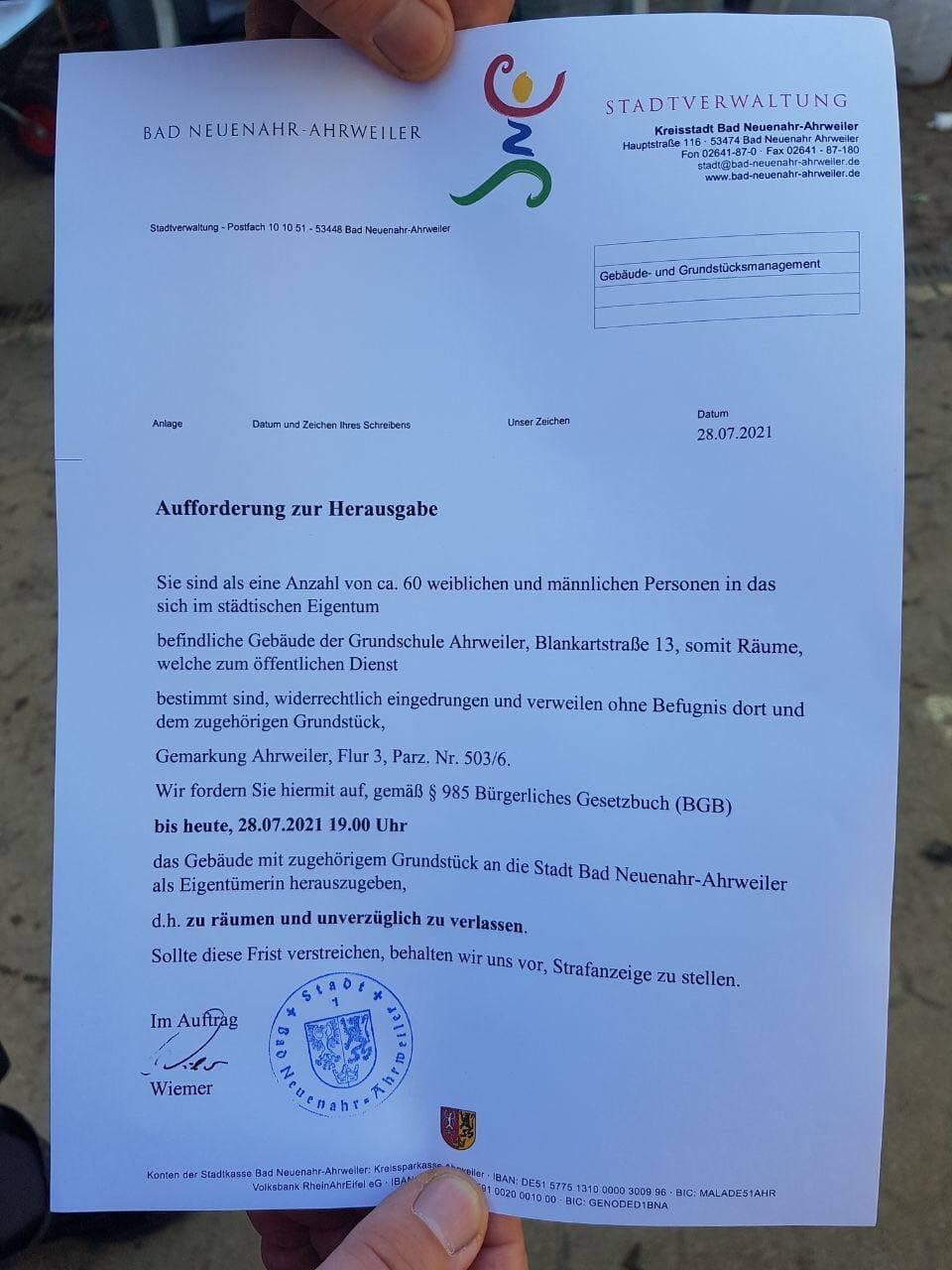 In der Schule war nicht nur ein Lager für Hilfsgüter entstanden, sondern auch Übernachtungsplätze für Helfer und eine kostenlose Essenausgabe mit bis zu 1.000 Essen täglich – bis die Stadt den 70 Helfern vor Ort die Räumung in vier Stunden zu 19 Uhr schriftlich per Verfügung und unter Strafandrohung ankündigte.
