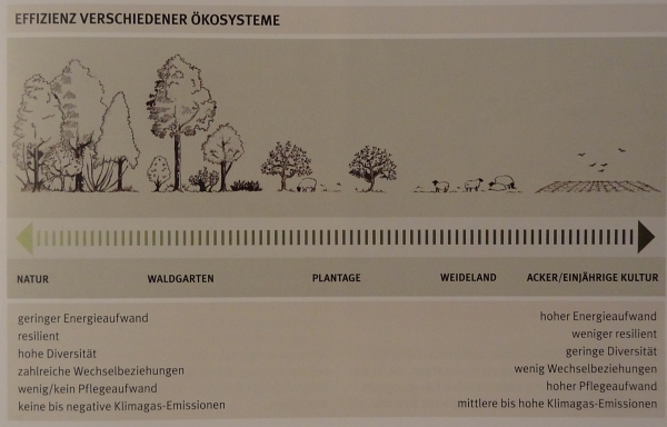 In feuchten, gemäßigten Klimazonen ist der Entwicklungshöhepunkt der Vegetation (Klimax) eine Waldlandschaft oder ein Wald. Das heißt, wenn Sie auf einem Stück Land nicht eingreifen, dann wird es mit der Zeit zu einem Wald: Die natürlichen Kräfte entwickeln die Landschaft aktiv hin zu einer Waldlandschaft. Je weiter Ihr landwirtschaftliches oder gartenbauliches System von einem Wald entfernt ist, desto mehr Energie ist zu seiner Erhaltung notwendig und desto gestörter und entfernter ist dieses System von einem über Lange Zeit nachhaltigen biologischen Zustand. Daher erfordern Felder und jährlich bewirtschaftete Flächen die meiste Energie, Weideland etwas weniger und Obstplantagen-Systeme noch weniger. Natürlicher Wald benötigt keine menschliche Energie zu seiner Erhaltung, er kümmert sich um sich selbst. Waldgärten liegen hier zwischen Plantagen und natürlichem Wald und bilden demnach ein System zur Erzeugung nützlicher Produkte mit einer der niedrigsten erforderlichen Energieaufwendungen.“