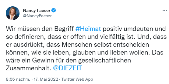 Quelle: https://twitter.com/NancyFaeser/status/1526637717752274946?s=20&t=dmzlyC_qRWzaSIyX2mqnNw